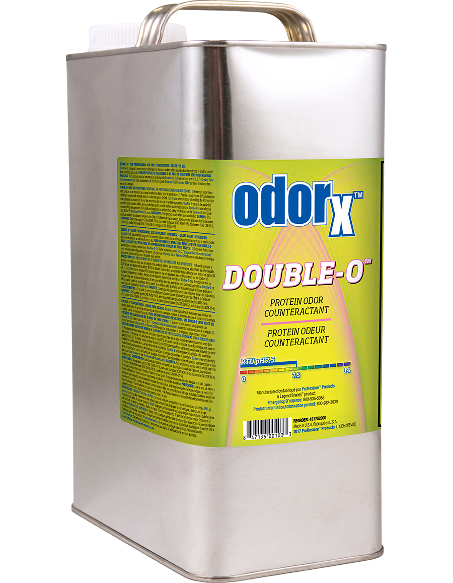 The ODORx Double-O is our best protein odor control solution. Specially formulated to eliminate protein odors resulting from kitchen fires, burned meat, spoiled food and more. Also highly effective against sewage and water damage odors.