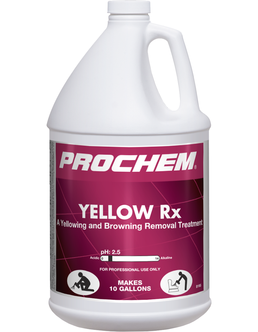 Prochem's Yellow Rx removes browning resulting from the breakdown of cellulosic fibers such as cotton and jute. It removes the most challenging yellow and brown discolorations caused by chemical residues on nylon, olefin and many natural fibers.